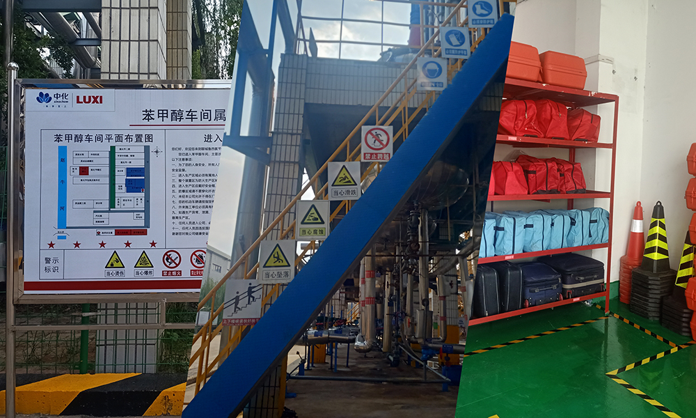 走進氯化芐事業部生產區,各類管理信息映入眼底。裝置主入口處設置了包含企業簡介、廠區平面布置圖、進入生產區域勞動防護用品要求等信息的宣傳欄,在主干道兩側醒目位置設置了企業HSE管理信息公告欄,信息公示屏正在公開循環展示企業安全里程碑及環保信息。在氯化鈣車間檢修現場,各類工器具均粘貼了合格標識,具有檢驗人、檢驗日期及檢驗結果等相關信息。現場氣瓶及托架已經按照標準要求涂色,氣瓶粘貼著安全警示標簽,瓶身也采用標牌標明了氣瓶狀態。來到應急站,室內使用貼地膠帶、油漆、名稱標識等方式對應急物資進行了定置擺放,視線之內物品放置整齊有序、取用方便、符合規范。
